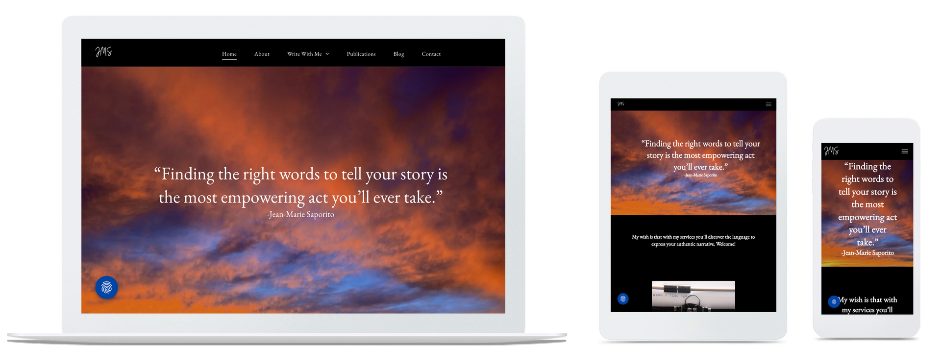 The intention for this project was to create a portfolio of Jean-Marie's publications, offer an area to connect with readers/students, and a place to promote writer's workshops and retreats.